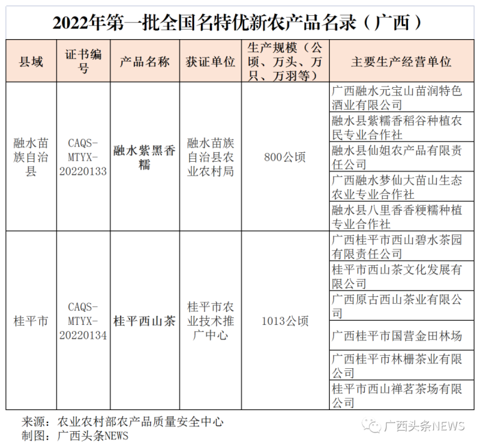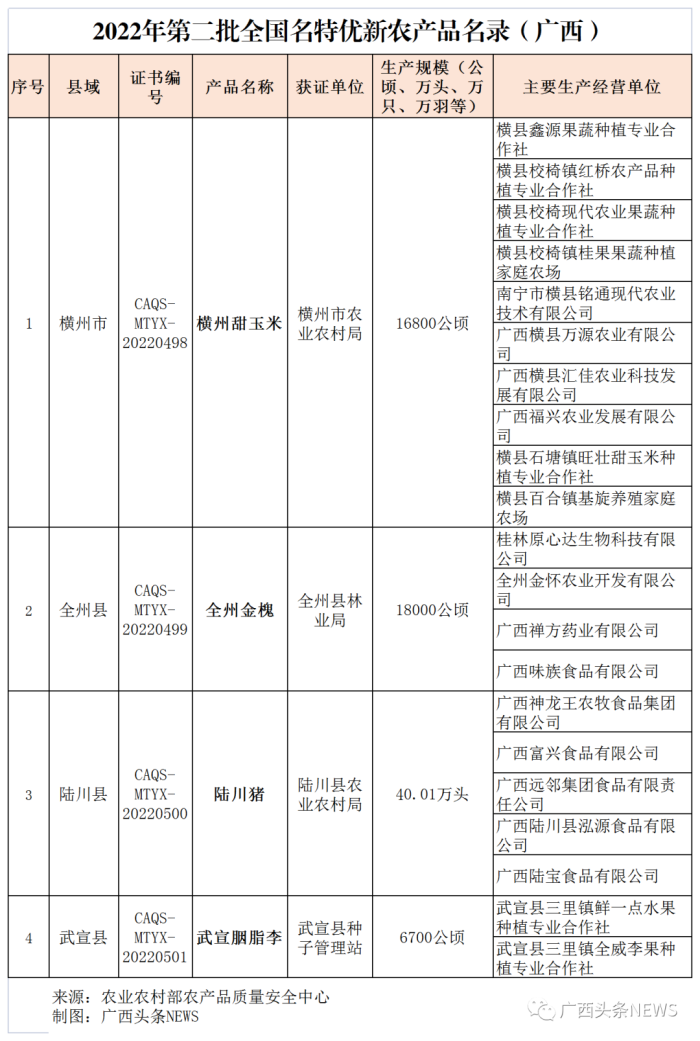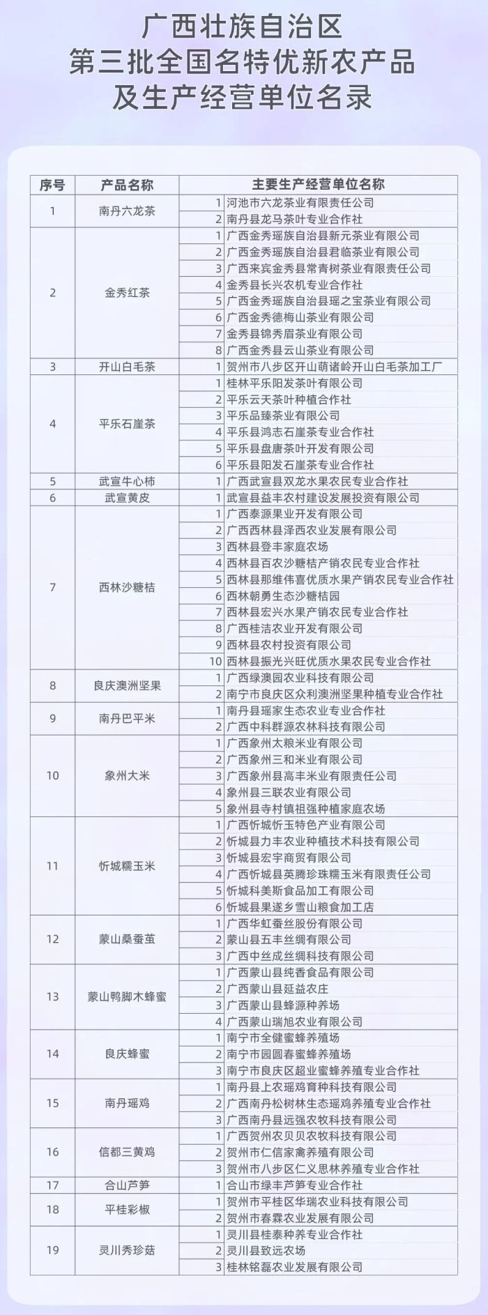 日前,农业农村部农产品质量安全中心公布2022年第三批全国名特优新农产品名录,全国共有426个产品入选该名录。广西有19个农产品入选“全国名特优新农产品”名录,快看看是你家乡的特产吗?