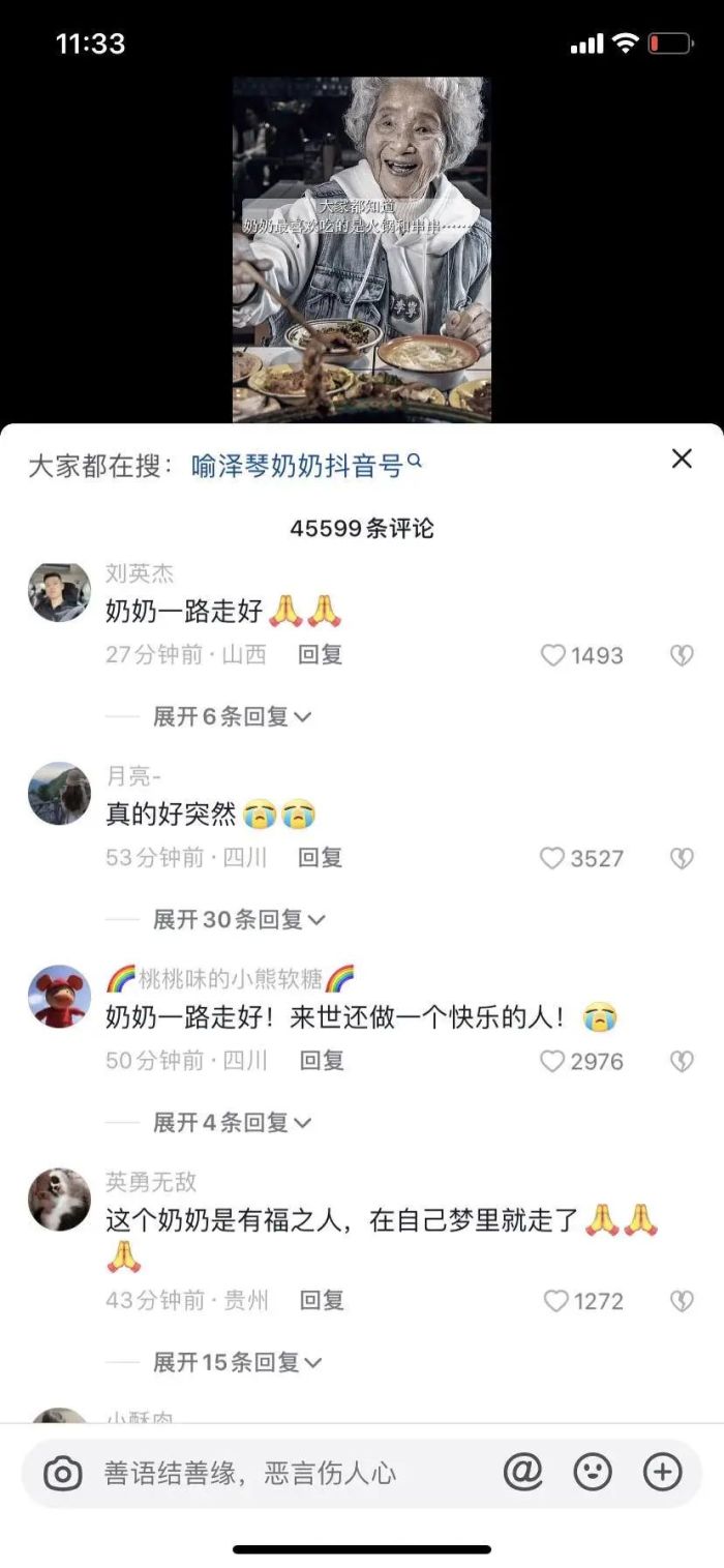 还记得紫牛新闻曾报道过的百岁网红“吃货奶奶”喻泽琴吗?12月30日,喻奶奶孙女蔡昀恩在社交平台发文称奶奶于12月29日凌晨离开人世,享年103岁。很多网友在评论区写下“一路走好”表达不舍之情。