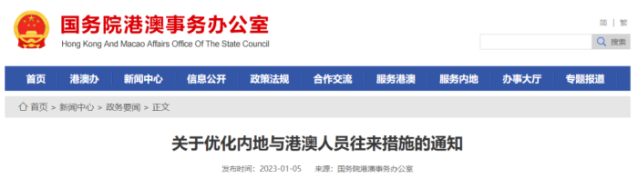 1月5日,国务院联防联控机制综合组发布《关于优化内地与港澳人员往来措施的通知》,全文如下: