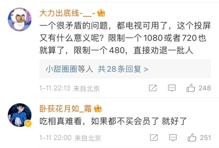 从爱奇艺官网了解到,黄金VIP会员连续包年118元/年,电脑、手机、平板可用,白金VIP会员连续包年198元/年,拥有黄金VIP会员权益的同时电视也可以使用,现在降低投屏的分辨率后,只能逼着想要投屏电视的用户选择白金VIP会员了。