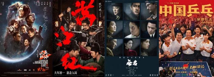 《流浪地球2》《满江红》《无名》《中国乒乓之绝地反击》电影海报。