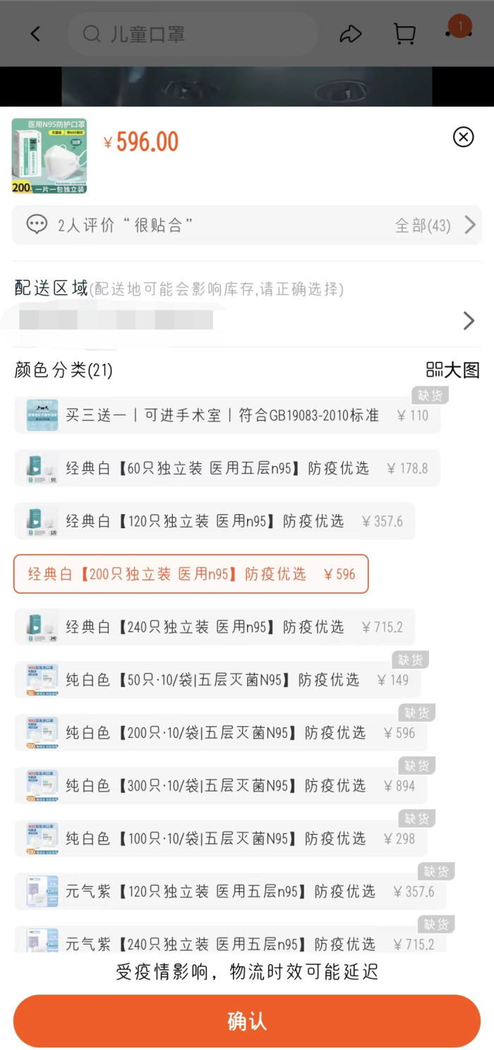 2022年12月14日,消费者熊女士在淘宝某旗舰店浏览过N95口罩,该店内的大部分N95口罩产品已缺货,她把剩下有货的规格类型截图分享给朋友。