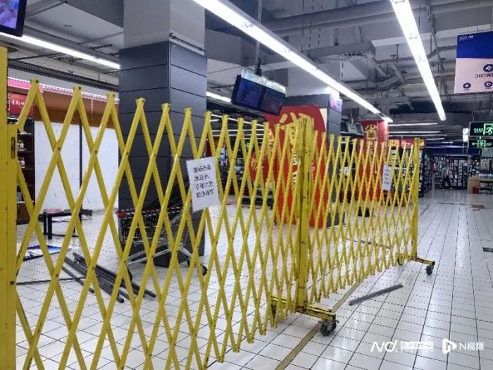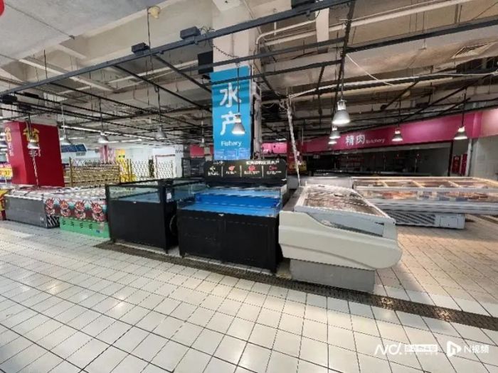 食品生鲜区猪肉水产档口全部空置,大区域已被围挡
