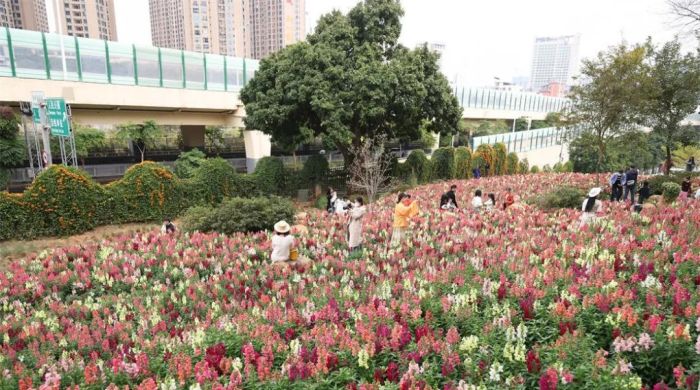 许多市民来到人民公园金鱼草花海拍照。南国早报记者 邹财麟 摄