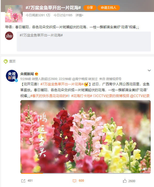 在央视的高清镜头下,一簇一簇绽放的花儿绽放勃勃生机,网友评论:没想到你是这么春意盎然的南宁!