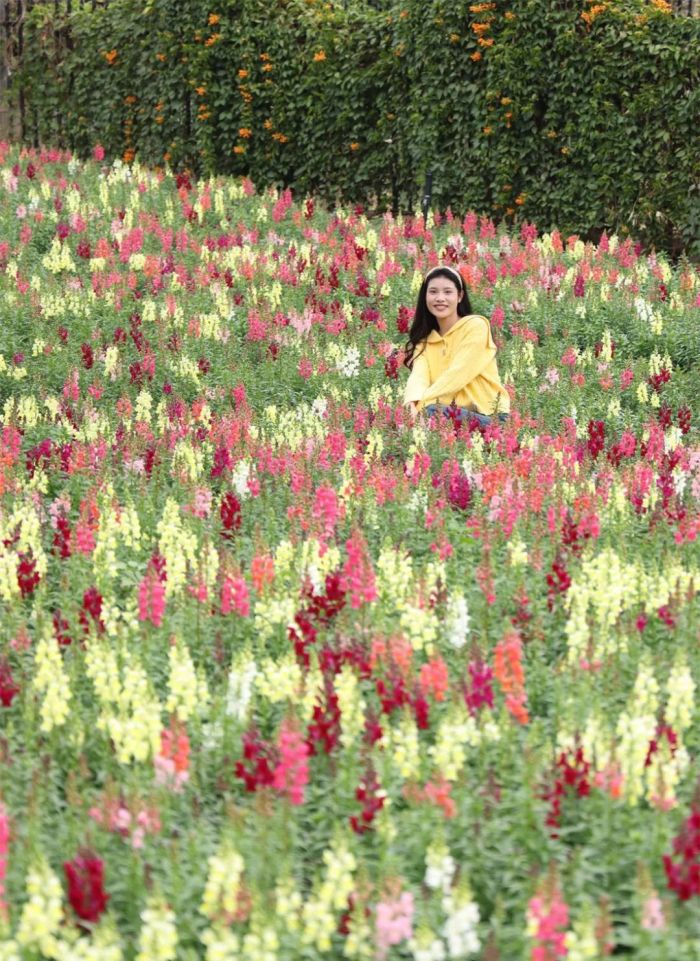 近日,在南宁人民公园花田里,金鱼草盛开。粉的、黄的、红的、白的,7万余株混色金鱼草在阳光的照耀下分外鲜艳妖娆,春风拂来,送来阵阵清香,举目远眺,犹如一幅巨型的彩色油画,引得市民游客纷纷拿出手机、相机留下春天的美景。
