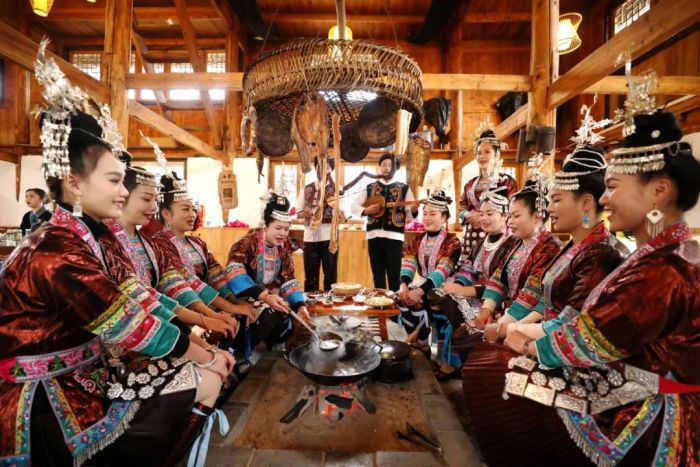 在古宜镇光辉村马湾·茶园里,侗族姑娘在展示侗族打油茶。图源:三江县委宣传部