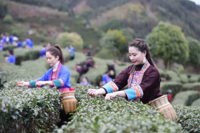 在古宜镇光辉村马湾·茶园里,侗族姑娘在采摘春茶。图源:三江县委宣传部