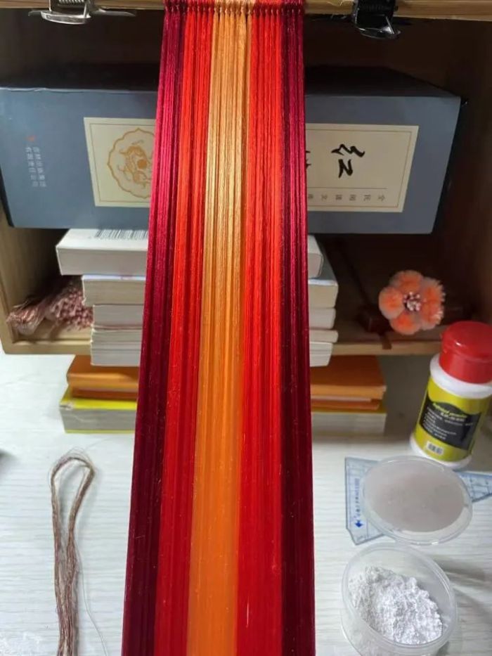 比如拴铜。将20多根绒线拴在1根铜丝上,每根铜丝直径仅为2-3.5mm。除了集中精神之外,还特别费眼睛。铜丝太细,很容易滑出手中。为了增大手指与铜丝之间的摩擦力,每次拴铜前,小丹都会在手上抹上滑石粉。拴铜时,她需要握住铜丝两端往反方向用力一拧,绒条才能成功“拴上”铜丝。多次重复操作后,双手难以避免地干燥发痛,时不时还会脱皮。