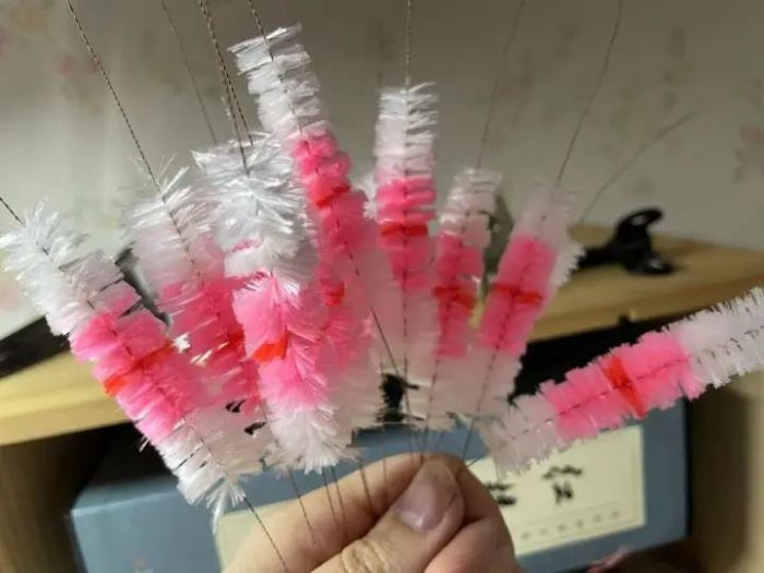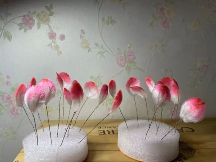 她先自学。在网上搜索了绒花的制作工艺和制作视频,大致了解了制作绒花头饰的工序和所需工具、材料,反复研究一些资深绒花制作者的制作视频和图文示意图。