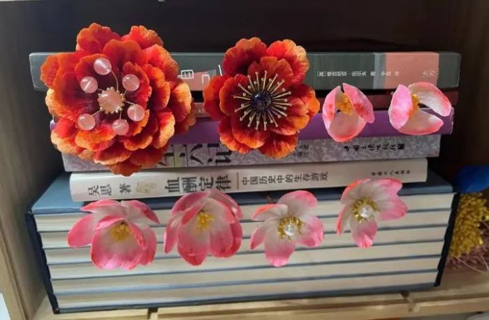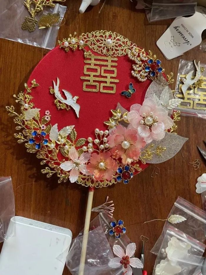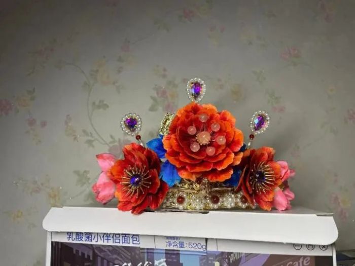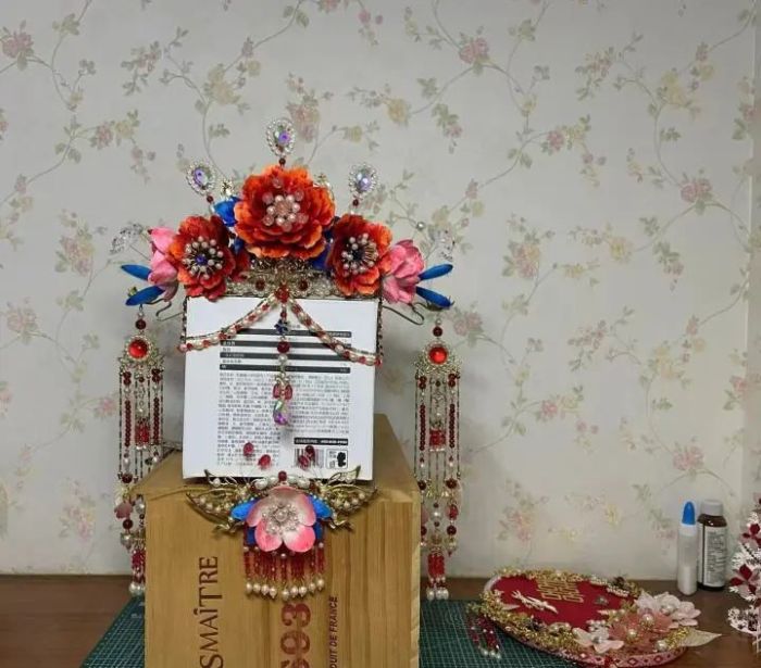 “刷了很多视频,一眼就相中了一款绒花婚冠,觉得很美。小李也很喜欢。不过市场上卖的不是不够好看,就是价格很高。当时也没多想,就觉得要让小李漂漂亮亮地出嫁,所以我决定给她做一顶婚冠。”