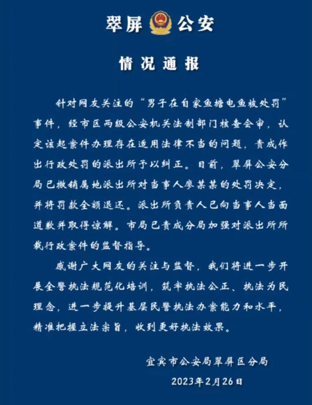 通报称:针对网友关注的“男子在自家鱼塘电鱼被处罚”事件,经宜宾市、翠屏区两级公安机关法制部门核查会审,认定该起案件办理存在“适用法律不当”的问题,责成作出行政处罚的派出所予以纠正。