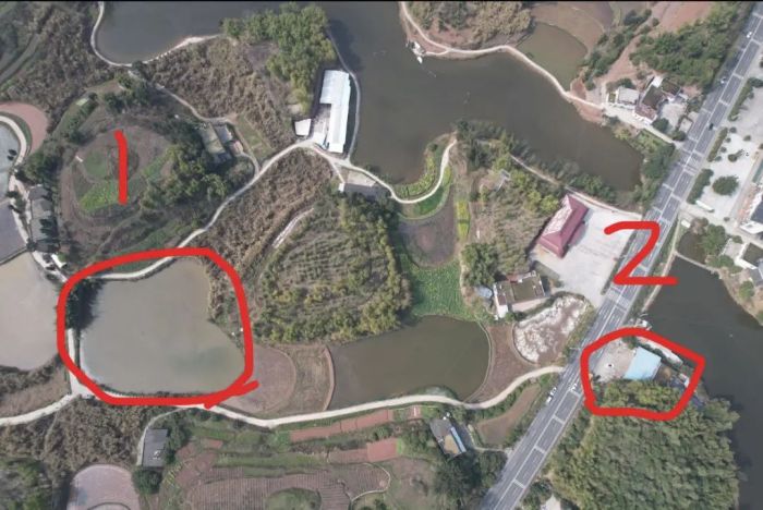 图1处为廖某某鱼塘;图2处是廖某某家。