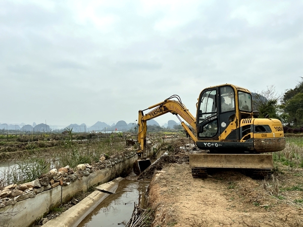 2月24日上午,记者在葡萄镇禄迪水库至乌龙村灌溉水渠看到,一台挖机正轰隆隆地进行作业,配合着工人师傅们对水渠损毁部分进行清淤、修复。一名村民告诉记者,去年汛期连续的强降雨造成短时雨水暴涨,将这条水渠冲毁了35米,大家都很担心会给今年的春耕带来不利影响,现在开工了,大概能在三天后完工,这下就不怕耽误种地了。
