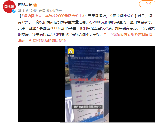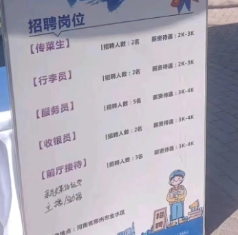 据@九派新闻 消息,近日,河南财经政法大学内一场招聘会上,酒店、餐饮企业发布的招聘岗位引发关注