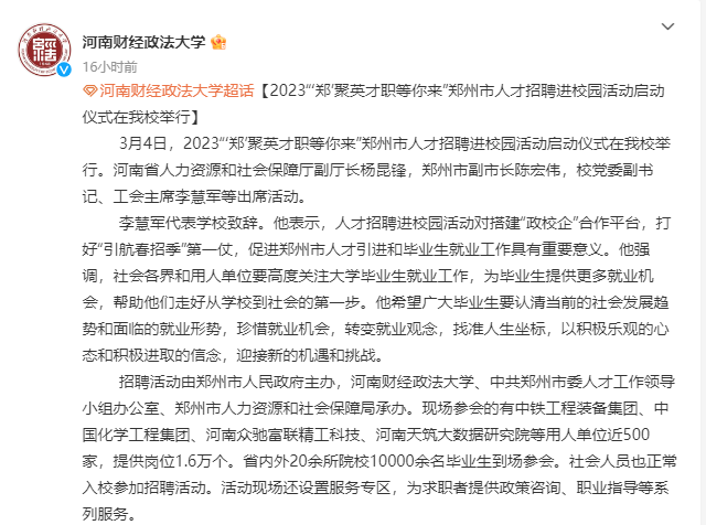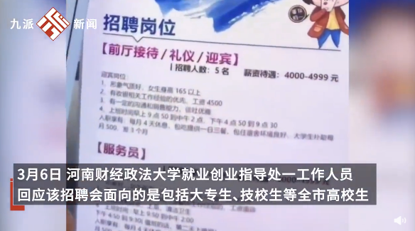 3月6日,河南财经政法大学工作人员回应媒体表示,此次招聘会的主办方为郑州市人才交流中心,学校为承办方,提供场地。