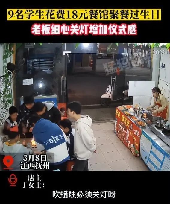 9名学生消费18元,在小吃店“借”了个场地,庆祝生日。店老板不仅没有嫌麻烦,还主动给他们关灯营造氛围。这温馨的一幕发生在江西抚州。3月11日上午,小吃店丁老板告诉记者,自己的店面是个平价小店,当时看到这些孩子就像看到年少时的自己。