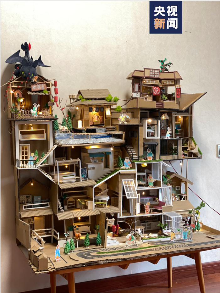 妈妈吴女士介绍女儿叫蒋易汝,从小喜欢做手工,放假期间,母女俩尝试用废旧纸盒打造一座小镇,她们从一所小房子开始,用了大约一个月时间,制成了一座高120厘米的作品,在这里,每间屋子都有一个主题从咖啡厅、茶室、客厅到沙发、灯笼、盆栽一应俱全