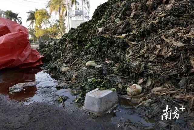 ▲堆积数天的芥菜混杂着污水和垃圾。