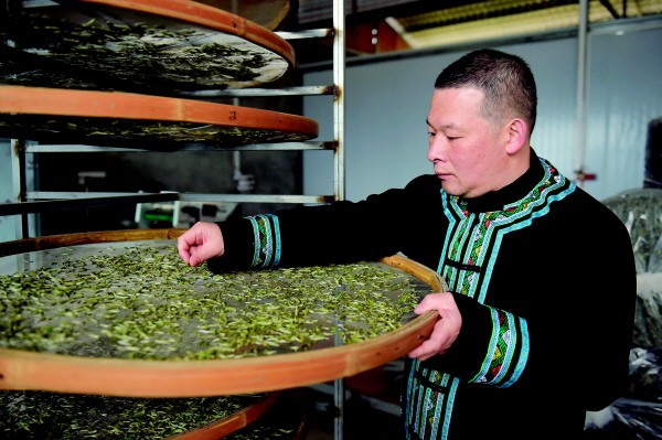 正因如此,当地很多村民便成了茶园里的工人。穿梭在茶园中娴熟地采摘嫩芽的苗族村民阳政梅就是其中之一。她说:“我们村里没有出去打工的妇女和老人,每年都会到这里采茶。我采得慢,每天能采三四斤,有些采得快的每天能采五六斤,按照30元一斤计算,一天能挣一百多块钱呢。在家门口就能打工挣钱,还能照顾家人,蛮好。”