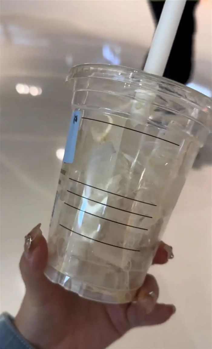 ▲张女士的生椰拿铁喝完后,剩下半杯冰块。(视频截图)