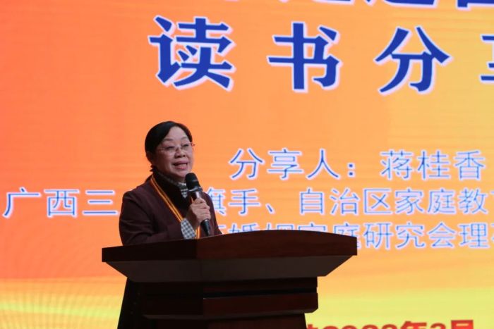 广西三八红旗手、广西家庭教育研究会成员、广西婚姻家庭研究会理事蒋桂香结合家庭教育工作讲述了《习近平走进百姓家》的学习意义,将贯彻落实家庭家教家风建设,在家庭建设、家庭教育、家风建设和未成年人心理建设方面做出更多贡献。