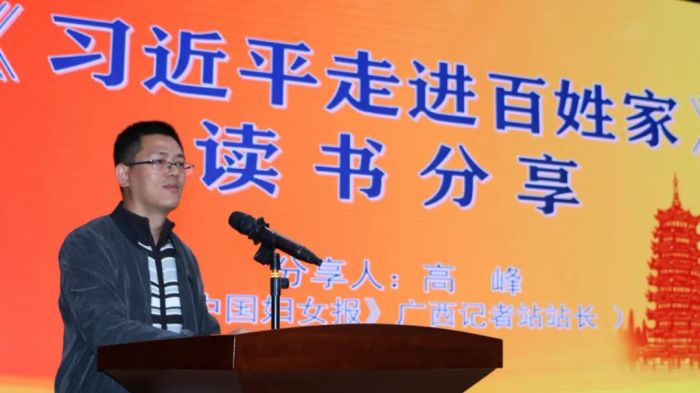 当天活动特意邀请了《习近平走进百姓家》一书的创作者之一、王德利家庭篇目的主笔、《中国妇女报》广西记者站站长高峰。高峰从女报人的角度,分享了《习近平走进百姓家》王德利家庭篇目创作历程,表示将继续践行全媒体时代的群众路线,深入基层,讲好新时代独具女报特色的女性故事、家庭故事。