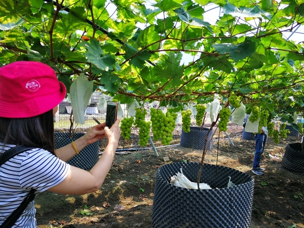 民治村委“阳光玫瑰”葡萄大棚种植基地内一名游客正在拍照留念。灵川镇供图