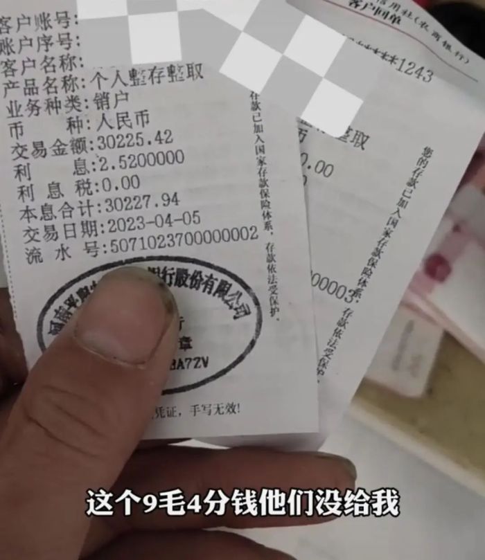 4月5日,有网友发视频称,自己在一家银行取钱,本息合计30227.94元,结果只收到了30227元。对此,银行业务员回复称,没有零钱,不满1元全部抹掉。该网友质疑,“银行一天要进多少客户?这个钱到底去哪了?”
