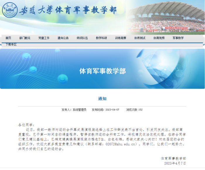 近日,我部一教师对运动会开幕式展演服装选择上在工作群发表不当言论,引发网友关注。我部高度重视,已于第一时间启动调查程序,暂停该教师运动会所有工作,将视情况依法依规处理。