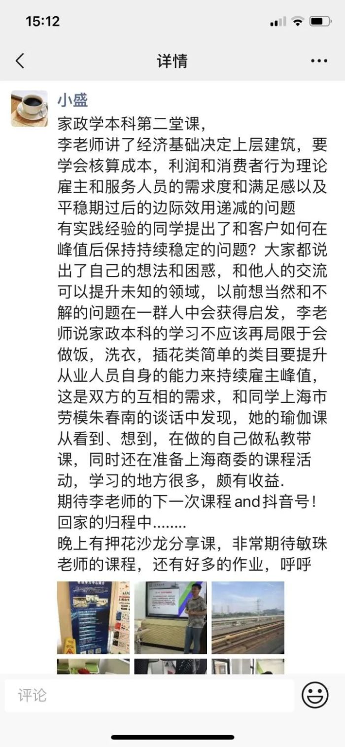 孙明芳 图源:受访者供图另一些变化正渗入她们的家庭和周边。孙明芳对心理学课上学习的非暴力沟通印象深刻,“比如,工作一天回家,看到没人烧饭就说,‘这时候了,怎么还没烧饭?’,家人听了肯定不舒服。”如今,她开始尝试减少这种暴力倾向的语言,改变了和丈夫的沟通方式。理论知识的学习让初中辍学的许彩荣学会换位思考,“看问题有了不同角度”。47岁的她和25岁的儿子开始像朋友一样相处,“他会教我英语,平时也很牵挂我的学习情况。”成本核算、边际效应、消费者行为理论……当盛皋燕在朋友圈分享自己的学习心得,这些专业词汇也改变了家人朋友对家政的看法:“一些人说也想来修个第二学历。”