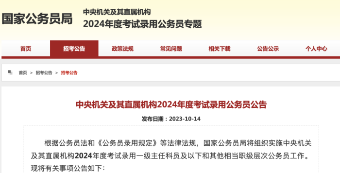 10月14日,中央机关及其直属机构2024年度考试录用公务员公告发布,这些时间点要留意!详情如下: