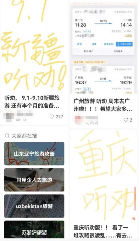 “家人们听我的劝,不要盲目跟风博主打卡,坐火车硬座过夜真的很疲惫,第二天旅游精神头都没了。”“姐妹们,要听劝啊,不要和半熟不熟的人一起旅游,闹了不愉快真的会很尴尬。”帮人避雷的“听劝体”笔记也非常有人气网友们把自己旅游中踩坑的地方分享出来供大家参考