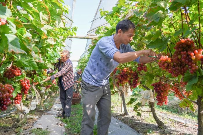 蕉江瑶族乡界顶村的村民在采摘红提。