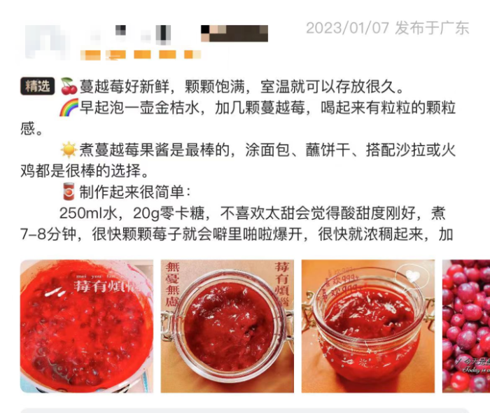 有网友自制了蔓越莓果酱,用来配酸奶、抹吐司,口味相当友好。