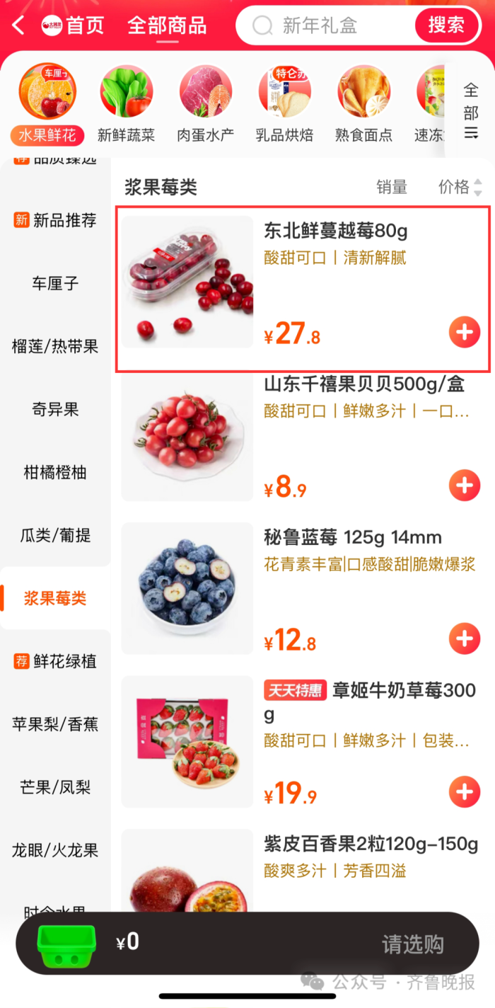 记者了解到,其实在济南的生鲜超市,就有蔓越莓鲜果的身影。济南大润发超市(经十东路店)售卖的东北鲜蔓越莓80g售价27.8元。