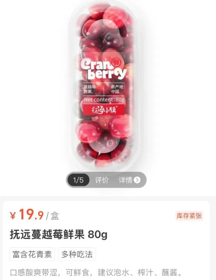 家住杭州市拱墅区的90后妹子火火,平时就是“小零食”爱好者,但还是头一次从社交平台知道蔓越莓鲜果,“想尝一尝鲜果的酸爽滋味。”她周末逛网上app的时候,发现门店内就有蔓越莓鲜果在售。昨天傍晚,她打开某App,杭城门店在售一款产自黑龙江抚远的蔓越莓鲜果,价格为59.8元/盒(310克),“点进去一看,仅剩一盒,有些紧俏。”