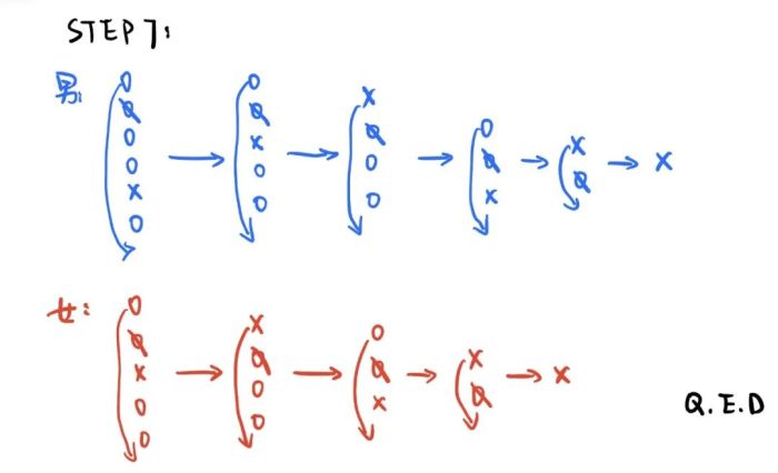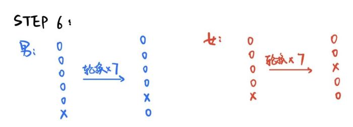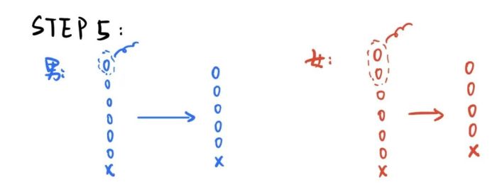 步骤五此时男生的牌堆为:00000X女生的牌堆为:0000X