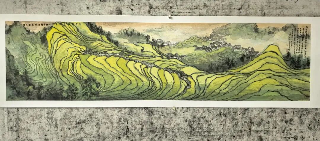 丁杰耗时数年,深入中国梯田腹地,其中包括桂林龙脊梯田,以艺术视角捕捉土地的生命力。其笔下的梯田既是具象景观,更是精神图腾,作品超越单纯风景描绘,将梯田升华为承载人类命运的象征,让观者在水墨、色彩与线条中感受农耕文明的深厚底蕴,以艺术化表达诠释守护粮食安全的重要意义。