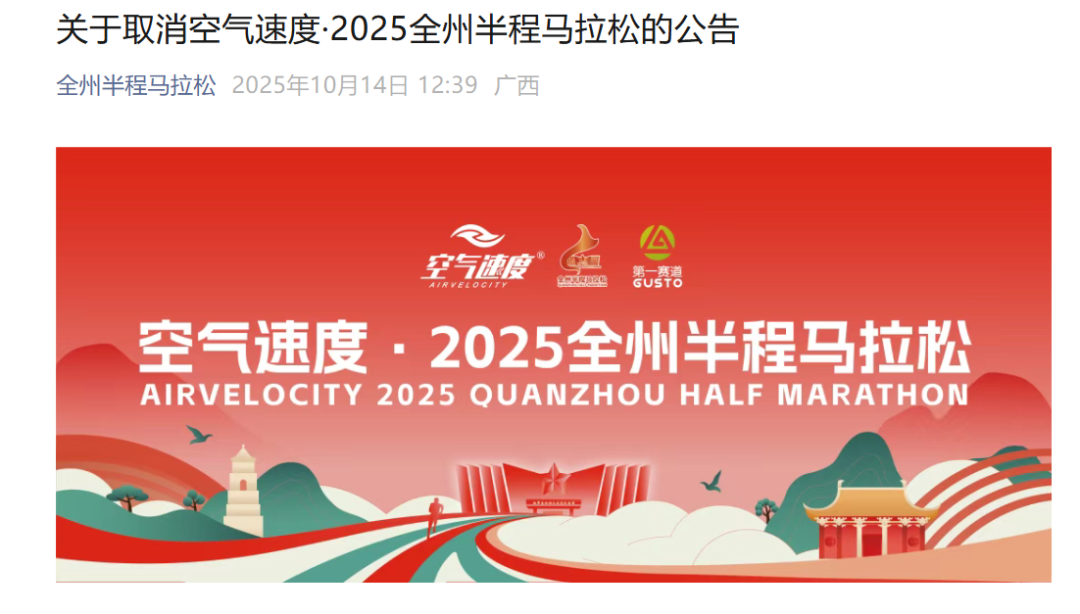 今天(10月14日)中午12点39分,全州半程马拉松官方公众号发布了“关于取消空气速度·2025全州半程马拉松的公告”。公告称原定于2025年10月19日举办的空气速度·2025全州半程马拉松因赛事计划调整,现宣布取消举办。