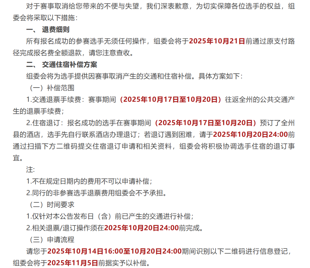 对于赛事取消给参赛选手带来的不便与失望,全州半程马拉松组委会深表歉意。为切实保障各位选手的权益,组委会将采取报名费全额退款,为选手提供因赛事取消产生的交通和住宿补偿等措施。