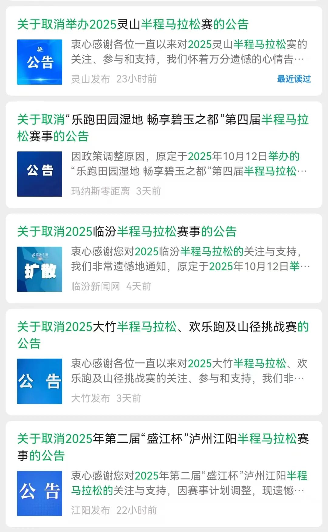 此外,原定于10月19日举办的河北保定的蠡县半程马拉松赛事,组委会也宣布因故取消。同样,原定于10月18日举办的2025北京龙形半程马拉松,也是距离赛事开启不到半个月的时间,组委会发布公告,称因政策因素,赛事将取消举办。