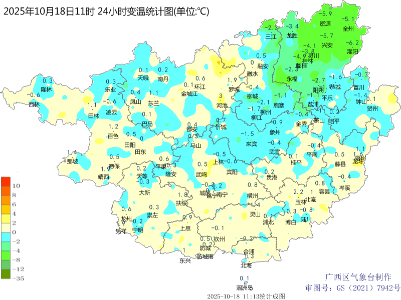 今天11时对比昨天11时,桂东北的气温已出现2~6℃的降幅。预计四天内,广西将自北向南出现大风、降温以及寒露风天气。