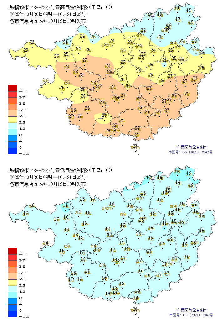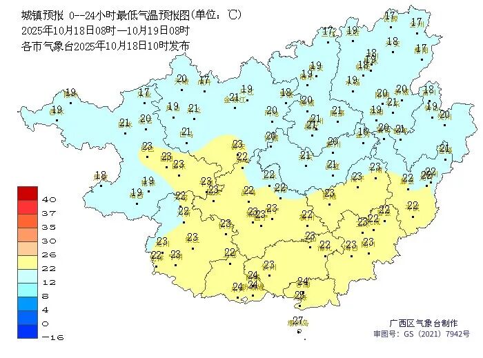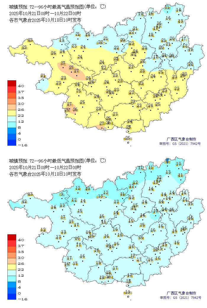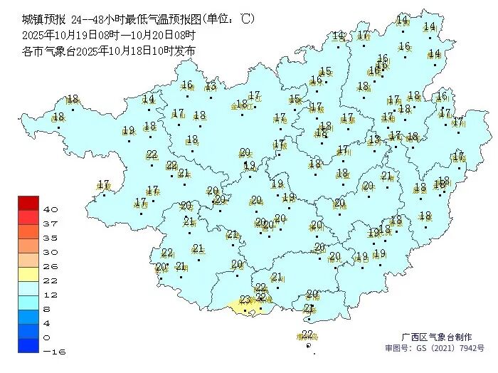 18-21日受冷空气持续补充影响,各地气温下降幅度:桂东北7~9℃、局地10℃以上,其它地区4~6℃。桂北18日开始,桂南20日开始有5-7天日平均气温≤22℃的寒露风天气。