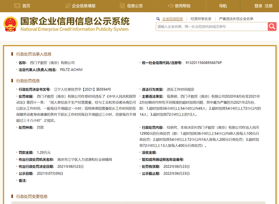 7月12日,记者从国家企业信用信息公示系统了解到,因违反工作时间规定,近日,西门子数控(南京)有限公司被江苏南京市江宁区人力资源和社会保障局处以罚款人民币1.29万元。