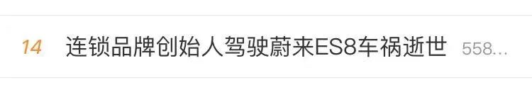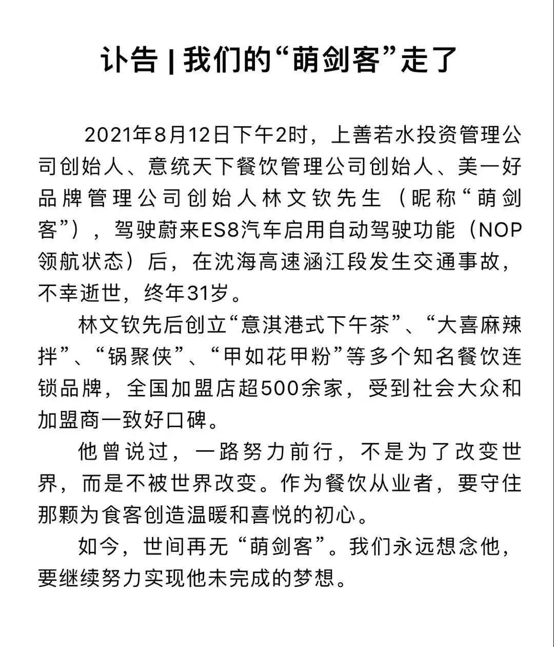 昨晚,一个名为“美一好”的个人公众号发布讣告称:2021年8月12日下午2时,上善若水投资管理公司创始人、意统天下餐饮管理公司创始人、美一好品牌管理公司创始人林文钦先生,驾驶蔚来ES8汽车启用自动驾驶功能(NOP领航状态)后,在沈海高速涵江段发生交通事故,不幸逝世,终年31岁。