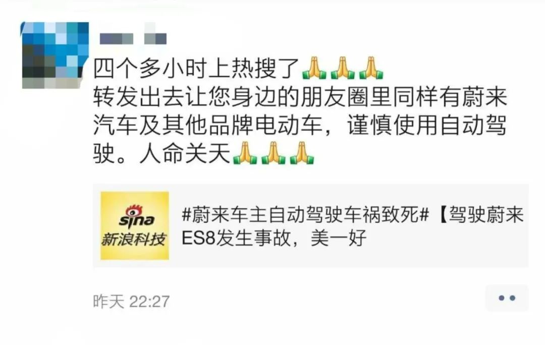 “可以确定的是,事发时蔚来汽车正处于NOP状态,这是蔚来工作人员告诉我们的。”而之所以发这个讣告,是想提醒广大车友谨慎用这个(NOP,蔚来汽车辅助驾驶功能)。“毕竟这是人命关天的事情,有义务告知一下。"