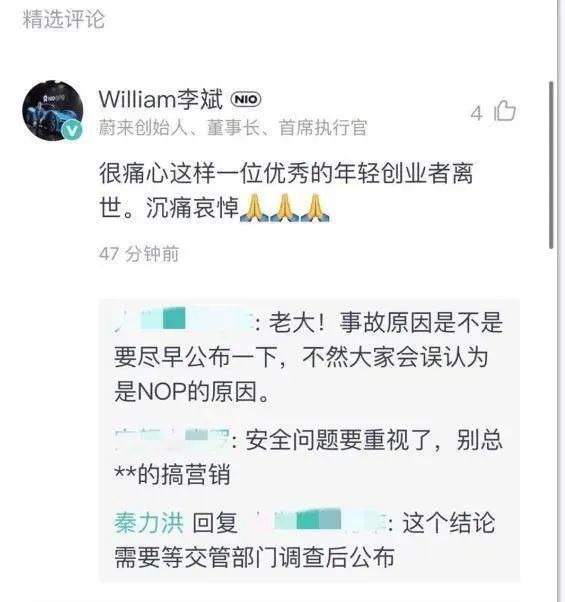 而在该文章下方,蔚来创始人、董事长、首席执行官李斌也留言表示,很痛心这样一位优秀的年轻创业者离世。