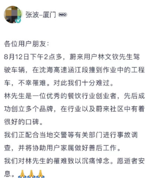 在微信小程序“蔚来”里,标记为ES8创世版车主的用户“张波-厦门”曾发文称,蔚来用户林文钦先生驾驶车辆,在沈海高速涵江段撞到作业中的工程车,不幸罹难,对此他们感到十分难过。该用户还表示,他们正在配合当地交警等有关部门进行事故调查,将协助用户家属做好善后工作。