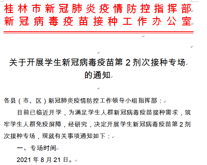 (一)象山区、秀峰区、叠彩区、七星区、雁山区范围内,初步安排以下接种单位开设学生新冠病毒疫苗第2剂次接种专场: